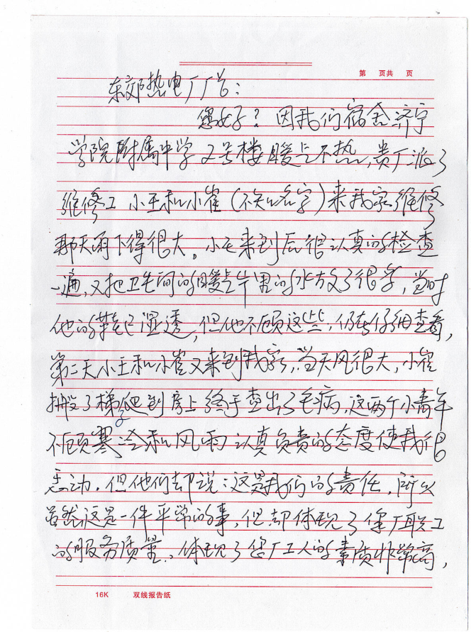 近日,山東聚源熱力公司收到一封來自濟(jì)寧學(xué)院附屬中學(xué)宿舍張老師寫的表揚(yáng)信,信中這樣寫道:“東郊熱電廠廠長(zhǎng)(現(xiàn)為山東聚源熱力)您好,因我們宿舍濟(jì)寧學(xué)院附屬中學(xué)2號(hào)樓暖氣不熱,貴廠派了維修工小王和小崔(不知名字)來我家維修。那天雨下得很大,小王來到后很認(rèn)真的檢查一遍,又把衛(wèi)生間的暖氣片里的水放了很多,當(dāng)時(shí)他的鞋已濕透,但他不顧這些,仍在仔細(xì)查看。第二天小王和小崔又來到我家,當(dāng)天風(fēng)很大,小崔搬了梯子爬到房上終于查處了毛病,這兩個(gè)小青年不顧寒冷和風(fēng)雨認(rèn)真負(fù)責(zé)的態(tài)度,使我很感動(dòng),但他們卻說這是我們的責(zé)任。雖然這是一件平常的事,但卻體現(xiàn)了您廠職工的服務(wù)質(zhì)量,體現(xiàn)了您廠工人的素質(zhì)非常高,也體現(xiàn)了您廠的廠風(fēng)正,培養(yǎng)了這么好的職工,請(qǐng)領(lǐng)導(dǎo)對(duì)他們進(jìn)行表揚(yáng),號(hào)召全體職工向他們學(xué)習(xí)。弘揚(yáng)正氣,使我們的社會(huì)更加和諧?!?/span>